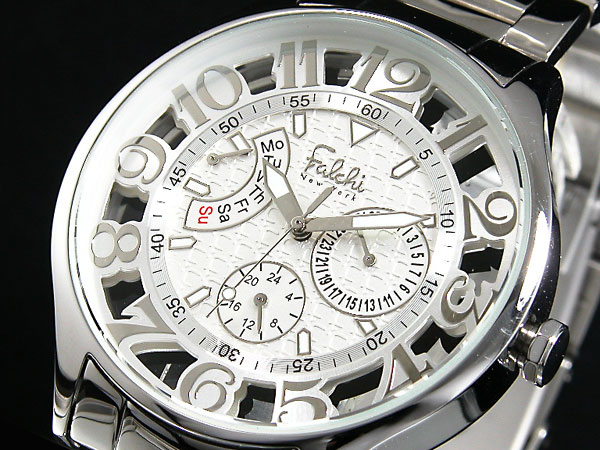 【Falchiファルチ】マルチカレンダー腕時計FR-080-02★★ Falchi New York ファルチニューヨーク ★★カルロス・ファルチは1944年ブラジルで産声を上げました。そして、19歳でニューヨークに渡り、コスチュームデザイナーとしてミックジャガーやティナ・タナーなど、一流アーティストの衣装デザインを手がけ成功を収めました。1980年に彼の手がけた作品がメトロポリタン美術館の永久保存コレクションに指定されました。1983年にはデザイン分野の業績を認められて、「コティ賞」を受賞しました。そして現在も尚、アメリカを代表するデザイナーとして 確固たるポジションを築いています。プレゼントやギフトにもおすすめ。Item Infomationサイズ (H×W×D) 約42×42×10mm素材 ステンレス仕様 クォーツ、シースルー文字盤、レトログラードカレンダー(曜日)、24時間計、日付カレンダー、蓄光(針、インデックス)、3気圧防水付属品 専用ケース、保証書、取扱説明書保証期間 1年間参考価格 102900円【Falchiファルチ】マルチカレンダー腕時計FR-080-02★★ Falchi New York ファルチニューヨーク ★★カルロス・ファルチは1944年ブラジルで産声を上げました。そして、19歳でニューヨークに渡り、コスチュームデザイナーとしてミックジャガーやティナ・タナーなど、一流アーティストの衣装デザインを手がけ成功を収めました。1980年に彼の手がけた作品がメトロポリタン美術館の永久保存コレクションに指定されました。1983年にはデザイン分野の業績を認められて、「コティ賞」を受賞しました。そして現在も尚、アメリカを代表するデザイナーとして 確固たるポジションを築いています。プレゼントやギフトにもおすすめ。Item Infomationサイズ (H×W×D) 約42×42×10mm 素材ステンレス仕様クォーツ、シースルー文字盤、レトログラードカレンダー(曜日)、24時間計、日付カレンダー、蓄光(針、インデックス)、3気圧防水付属品専用ケース、保証書、取扱説明書保証期間1年間参考価格102900円